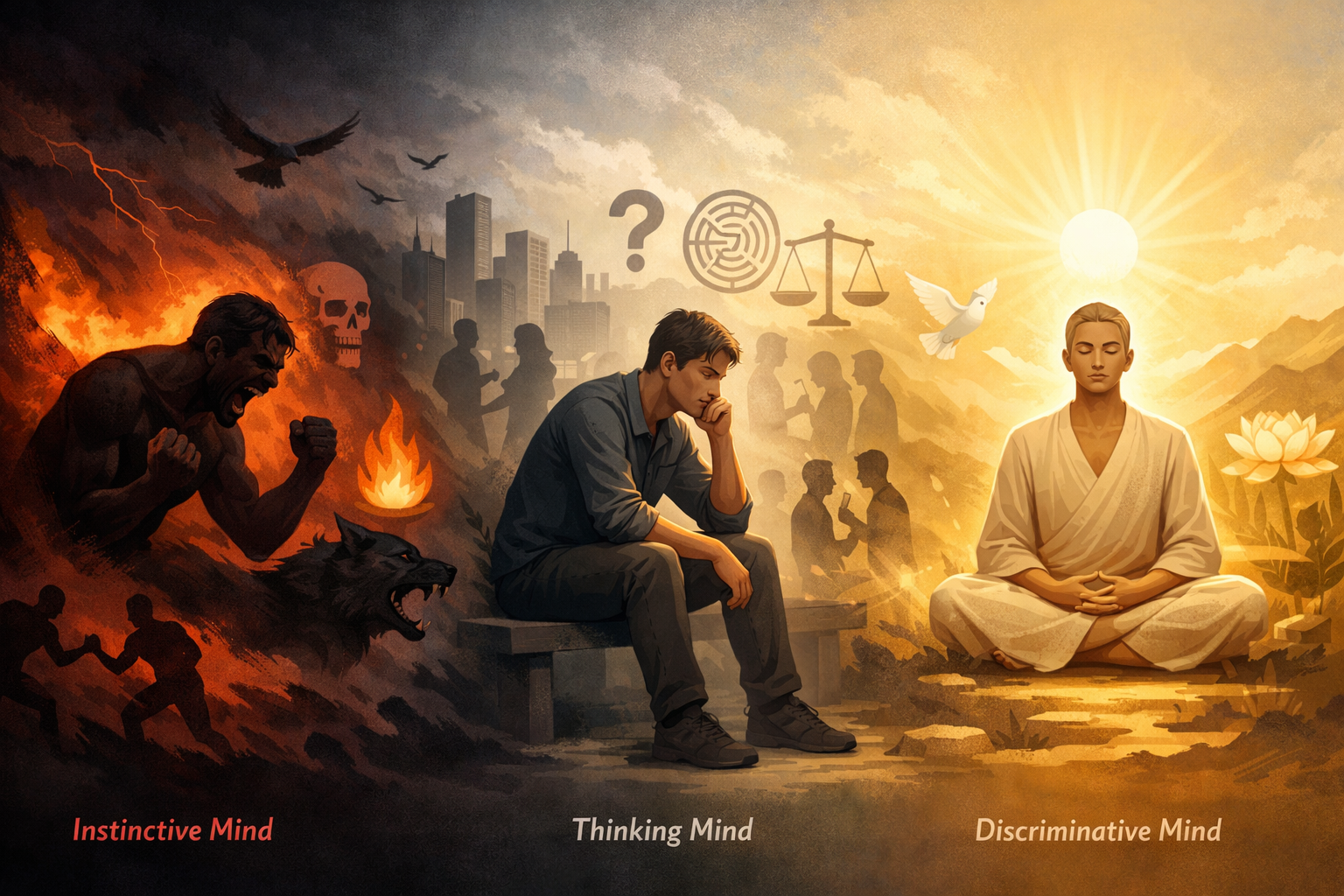 इस स्तर पर विवेक लगभग अनुपस्थित होता है। व्यक्ति सोचता नहीं, बस प्रतिक्रिया करता है। यहीं से जन्म लेते हैं— क्रोध हिंसा अंधी प्रतिस्पर्धा स्वार्थ